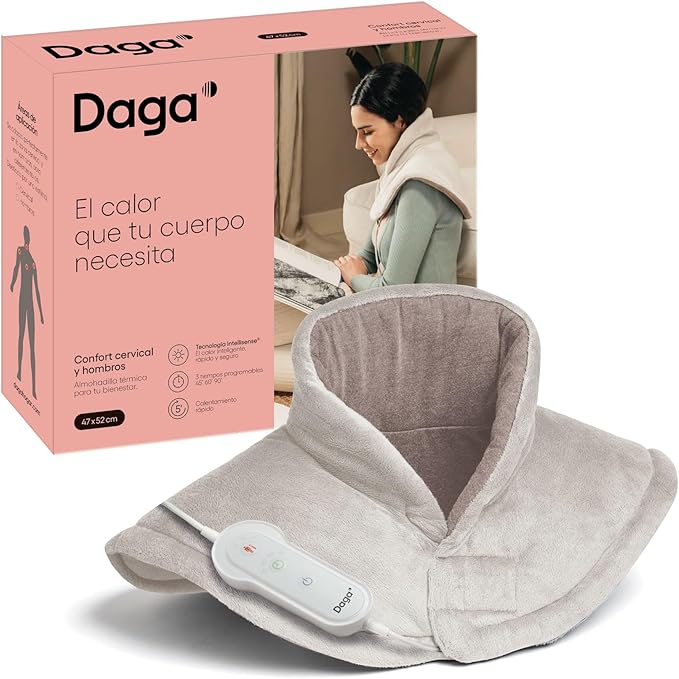 Daga Almohadilla Térmica Confort Cervical y Hombros: Esta manta eléctrica Daga es la mejor del mercado para los dolores cervicales y de hombros trapecios. Con ella, puedes calentar cómodamente esa zona que, con otras mantas eléctricas rectangulaes, es muy difícil de posicionar cómodamente. Tiene un temporizador de 45,60 y 90 minutos y 4 niveles de temperatura. Tiene la ventaja de que puede usarse mientras trabajas, ya que al abrocharse como un poncho, puedes sentarte y ajustártelo en la zona el cuello y seguir trabajando con las dos manos libres. Además, es lavable y cuenta con la Tecnología Intellisense, que nos protege de accidentes y/o posibles incendios.